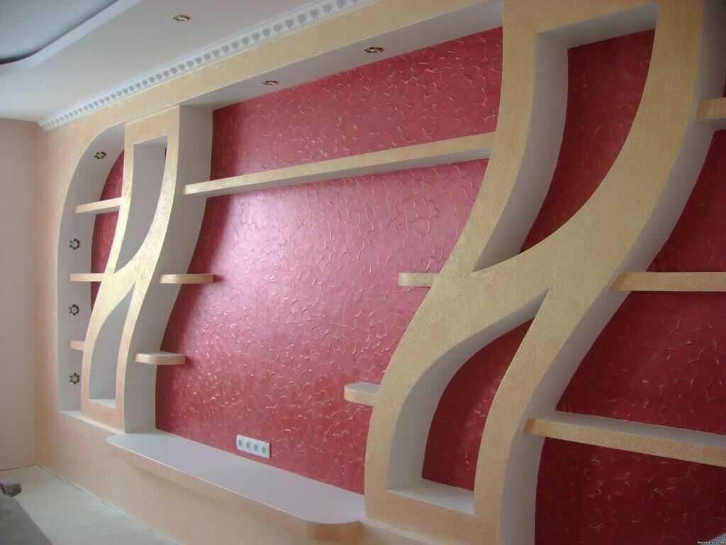 С помощью гипсокартона делается удобная полка для телевизора и функциональные ниши