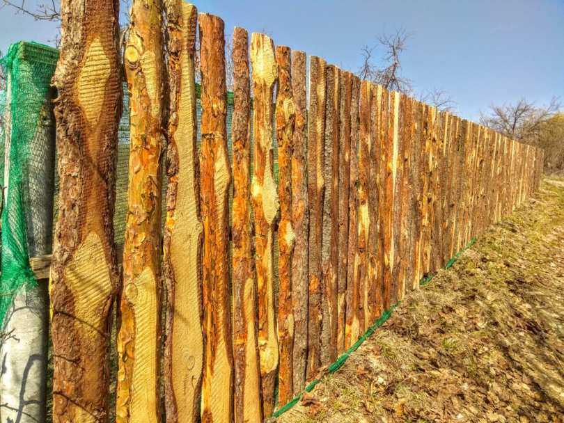 - Штакетник из необработанного материала. Принцип построения ограды остается неизменным, однако секция будет состоять из необработанных досок (с корой). Такой вариант целесообразно применять для ограждения дачного участка, частного дома.