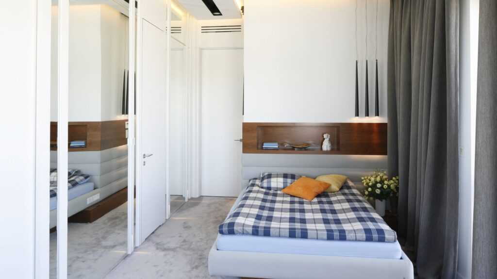 - Второе — не ставьте кровать в т.н. воздушный туннель, то есть на линии между дверью и окном, так как это, безусловно, отрицательно скажется на комфорте сна.