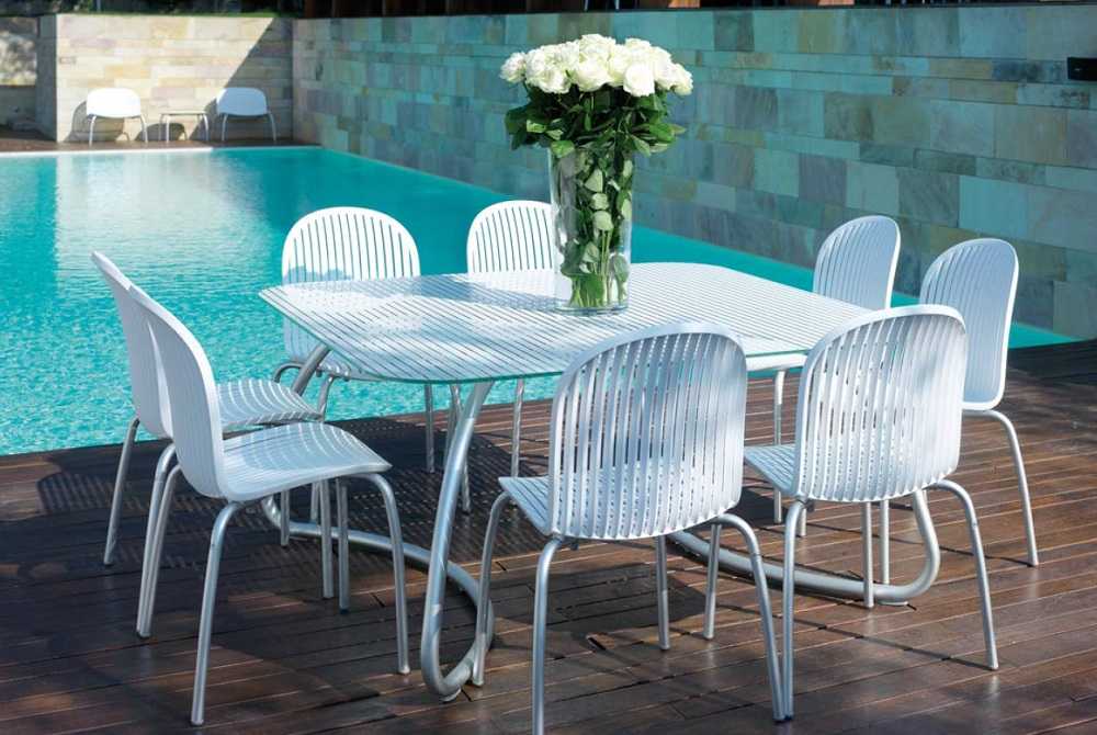 - Пластик может применяться в оснащении бассейна. Шезлонги, столики, стулья не должны быть подвержены воздействию влаги. Однако основные крепления могут быть выполнены из металла;