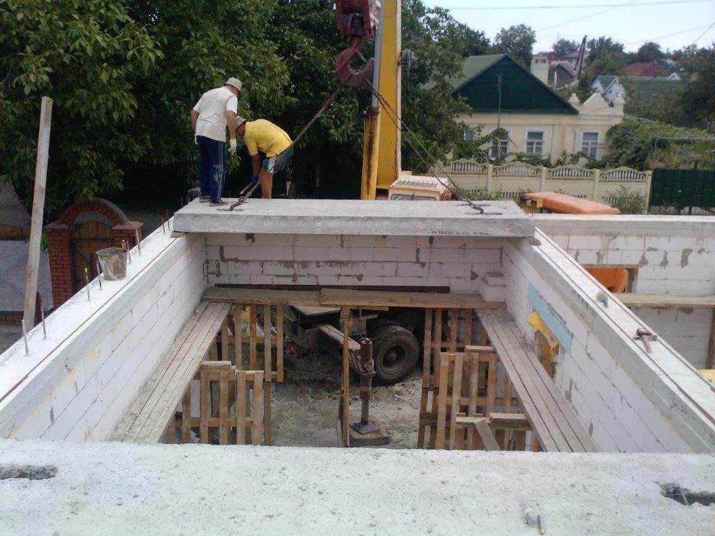 Под перекрытие из железобетонных плит необходимо устраивать усиленный армопояс с шириной, равной толщине стены, высотой 25-30 см, каркасом из 4 стержней горизонтальной арматуры.