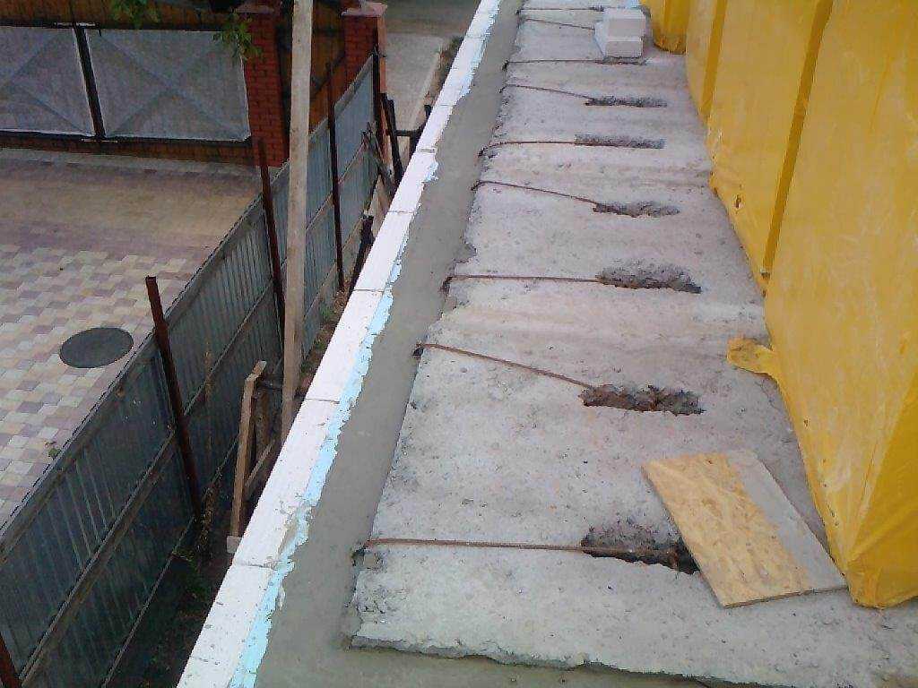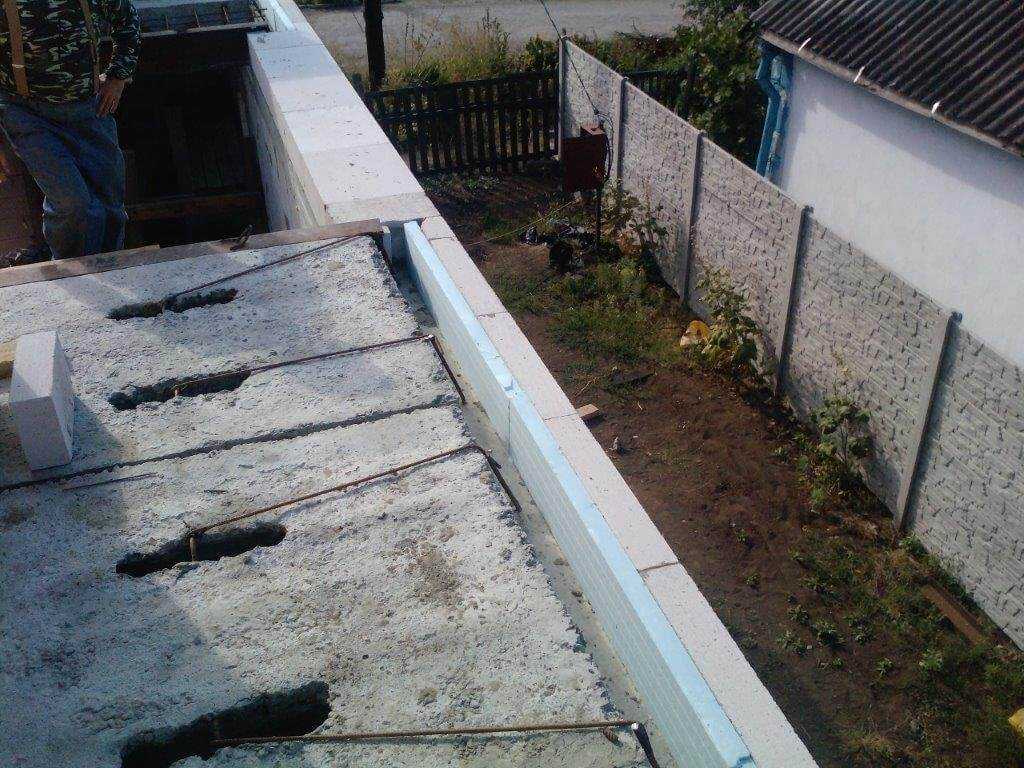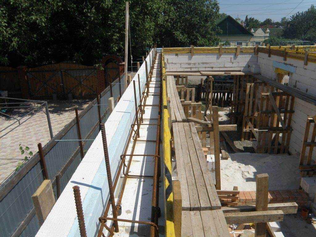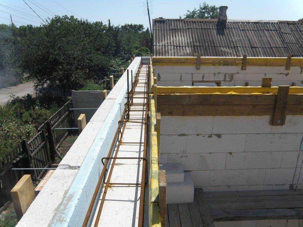 Армопояс является очень серьезным «мостиком» холода, через который уходит большая часть тепла, и на котором образовывается конденсат с внутренней стороны армопояса. И чтобы избежать этого, нужно произвести утепление внешней стороны армопояса газобетоном, или пенополистролом или пенопластом. Пенополистирол более предпочтителен. Так что заранее нужно предусмотреть пространство для утеплителя, заливая армопояс с отступом от внешнего края стены.