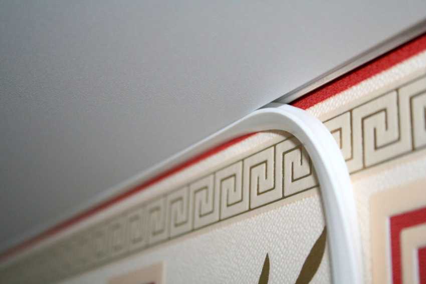 Профиль нарезают по размеру, прикрепляют к стене дюбель-шурупами, начиная от углов. Стыковку отдельных элементов выполняют только на прямых участках стены. Расстояние между соседними элементами крепления – 10-15 см. Отверстия в стене подготавливают заблаговременно таким способом: прикладывают багет к стене так, чтобы его нижняя часть совпадала с разметкой и сверлят отверстия через него. К потолку направляющие крепят напрямую или через закладную деревянную планку, в зависимости от того, насколько нужно опустить потолочный уровень. Профиль для фиксации изогнутых элементов надрезают на половину высоты. Эти участки следует зачистить наждачной бумагой, чтобы неровности не повредили пленку при дальнейшем монтаже. Элементы крепления располагают чуть чаще, чем на прямых участках.