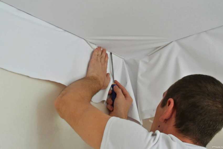 Крепление полотна начинают с углов и дальше растягивается с использованием тепловой пушки