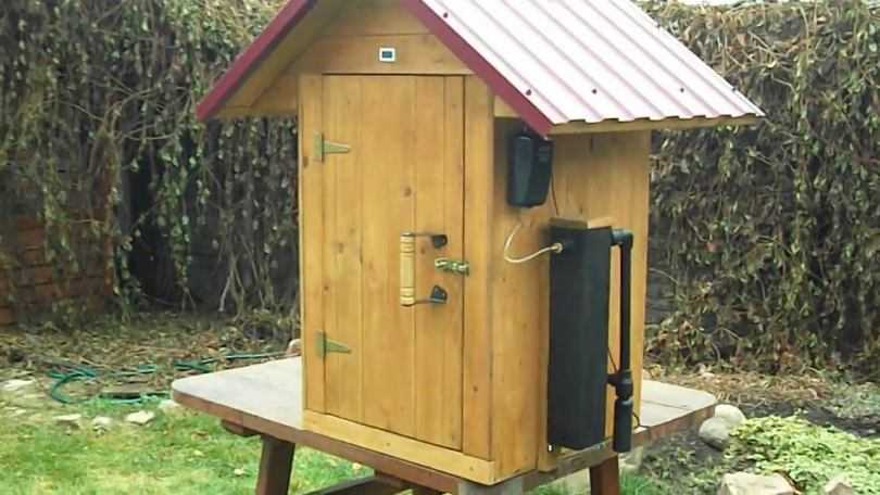 Из брусков из дерева делают основание для камеры. Затем к нему прибиваются ровные доски, которые должны прилегать очень плотно друг к другу. Это делается для того, чтобы дым не выходил через щели. Затем в крыше делается отверстие, в которое выводится труба.