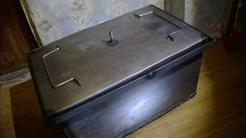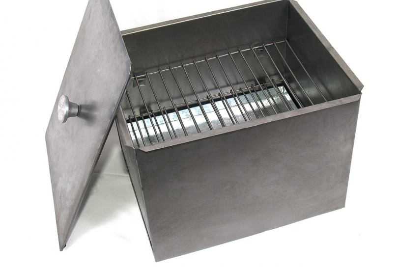 Чтобы сделать надежную коптильную камеру, выберите прочный металл – нержавеющую сталь. С виду такая конструкция похожа на короб. Во внутренней части приваривают уголки для двух металлических решеток.