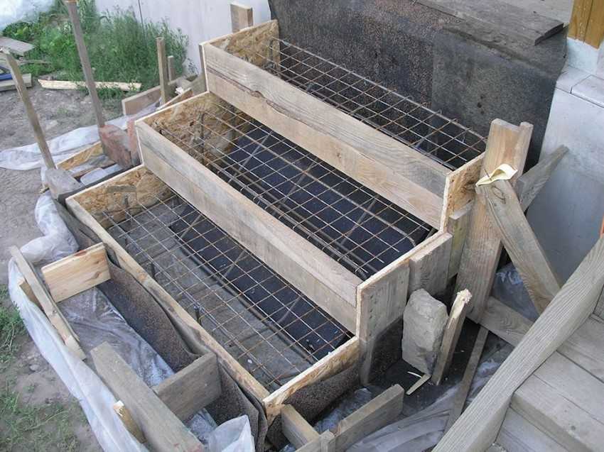 - Заливают каркас цементным раствором по слоям: сначала первую ступень по всей длине, после высыхания — вторую ступень. Каждый элемент подпирают опалубкой с лицевой стороны