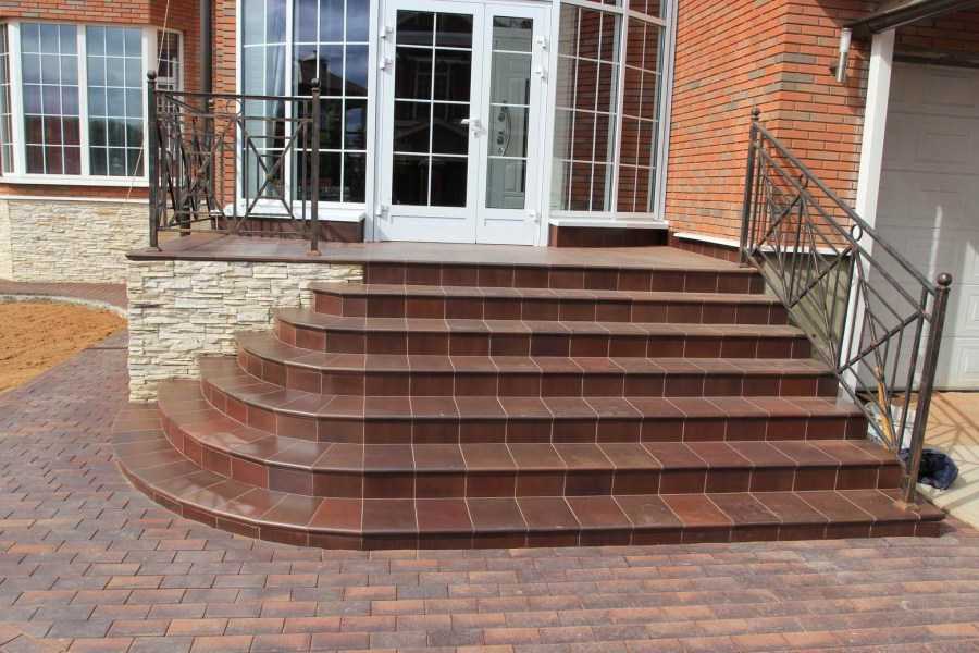 Максимально надежным признан керамический кирпич, который к тому же очень красиво выглядит. Ступеньки можно дополнить массивными перилами, также выложенными из кирпича или изящными коваными элементами с причудливыми завитушками, которые сделают крыльцо более легким и воздушным.
