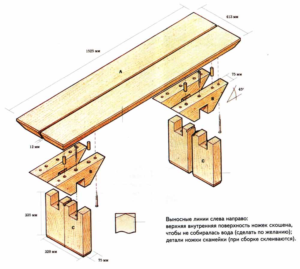 Состоящую из четырех ножек, сиденья, перекладин и раскосов лавку можно сделать очень быстро. К тому же такая конструкция будет высокоустойчивой. Для начала нарежьте составные части лавки: ножки размером 5×5 см, сиденье толщиной 5 см и подкосы такого же размера, как и ножки. Сделайте с внутренней стороны ножек врезки для поперечин.
