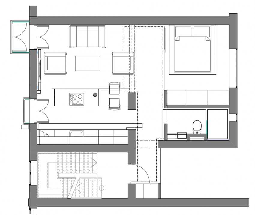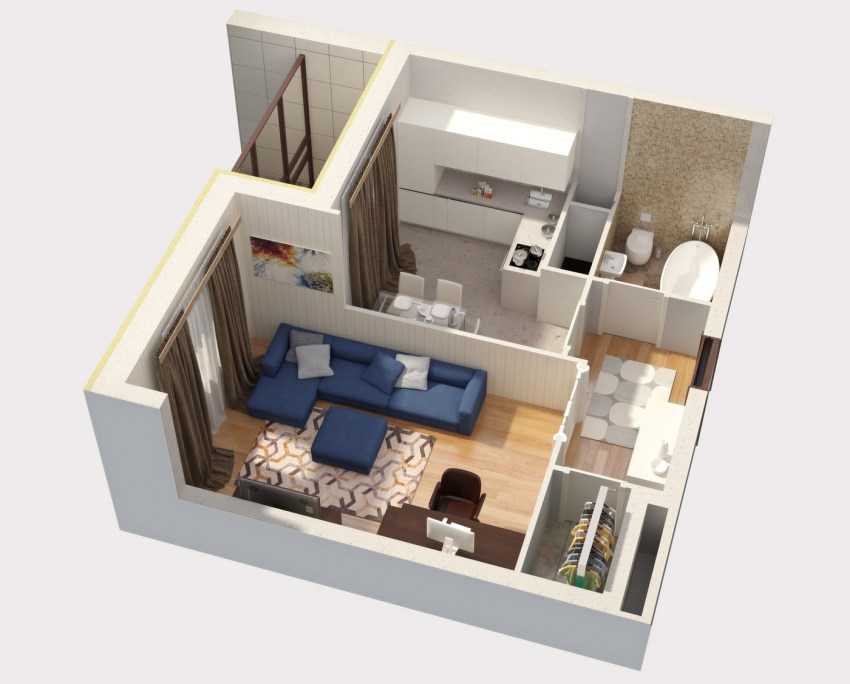 Еще один вариант — одна комната, в которой отведено место под несколько кухонных шкафчиков и плиту, стоит небольшой обеденный стол и есть спальное место. Такая планировка идеальна для проживания одного человека. Неплохо в ней себя будут чувствовать двое. В данном варианте санузла нет, так что придется строить туалет отдельно.