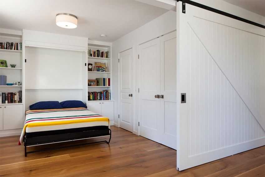 Двухсторонний стеллаж-перегородка может превратить помещение в спальню и гостиную, разграничив эти зоны. В такой перегородке устраивают полочки, ящики, а также откидную кровать или стол. Такое решение предоставляет возможность легкой трансформации помещения комнаты.
