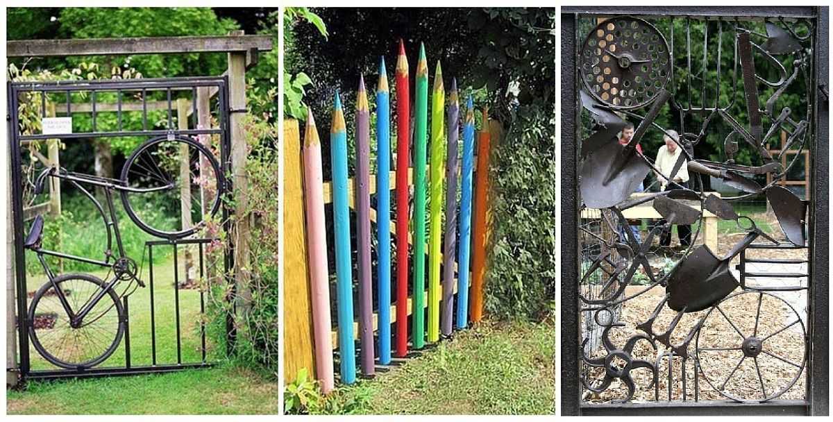 Сделать калитку не обычную, а красивую — это не так уж и сложно. И далеко не всегда для этого требуются дорогие материалы. Что всегда необходимо — это фантазия. Тогда даже велосипед, лопата, сучок или кирка — материал для эксклюзивного дизайна.