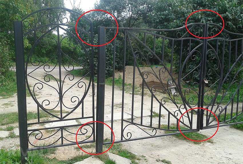 В зависимости от веса распашных ворот устанавливают 2 — 4 петли. Сначала их прихватывают, затем после удаления временных креплений проверяют ход створок. Окончательное сваривание ведется снизу вверх по периметру ушек. Для предотвращения снятия распашных ворот злоумышленниками на опоры устанавливают ограничители.