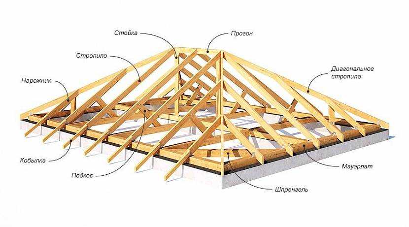 Опорами для стропил вальмовой крыши являются мауэрлат и коньковая балка. Кровельный скелет состоит из следующих деталей: