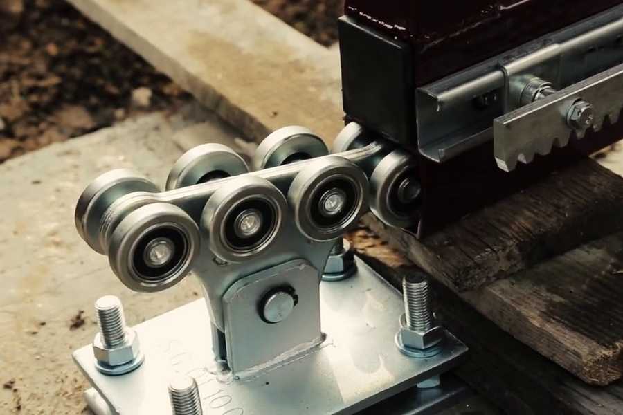 Чтобы створка при движении не проваливалась вниз, к ней приваривается откос, используемый как противовес. Его длину делают равной 0,5 ширины полотна. Всю нагрузку воспринимают опорные тележки, поэтому они крепятся к швеллеру, установленному на прочном бетонном фундаменте. Его также используют для монтажа электропривода дистанционного открытия ворот.