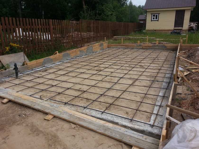 Для деревянных гаражей устраивают либо плитный фундамент, либо мелкозаглубленное бетонное основание. В нашем случае можно быстро сделать плитное основание, для заливки которого потребуется каркас из арматуры 30-40 мм и бетон. Арматурный каркас укладывается прямо на песок, соединение стержней в углах делают при помощи гнутых элементов. Заливку ведите постепенно до толщины плиты в пределах 30-40 см.