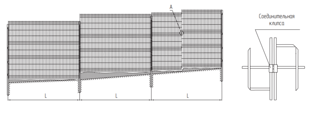 Установка панелей ограждения в случае перепада высоты осуществляется тремя вариантами:
