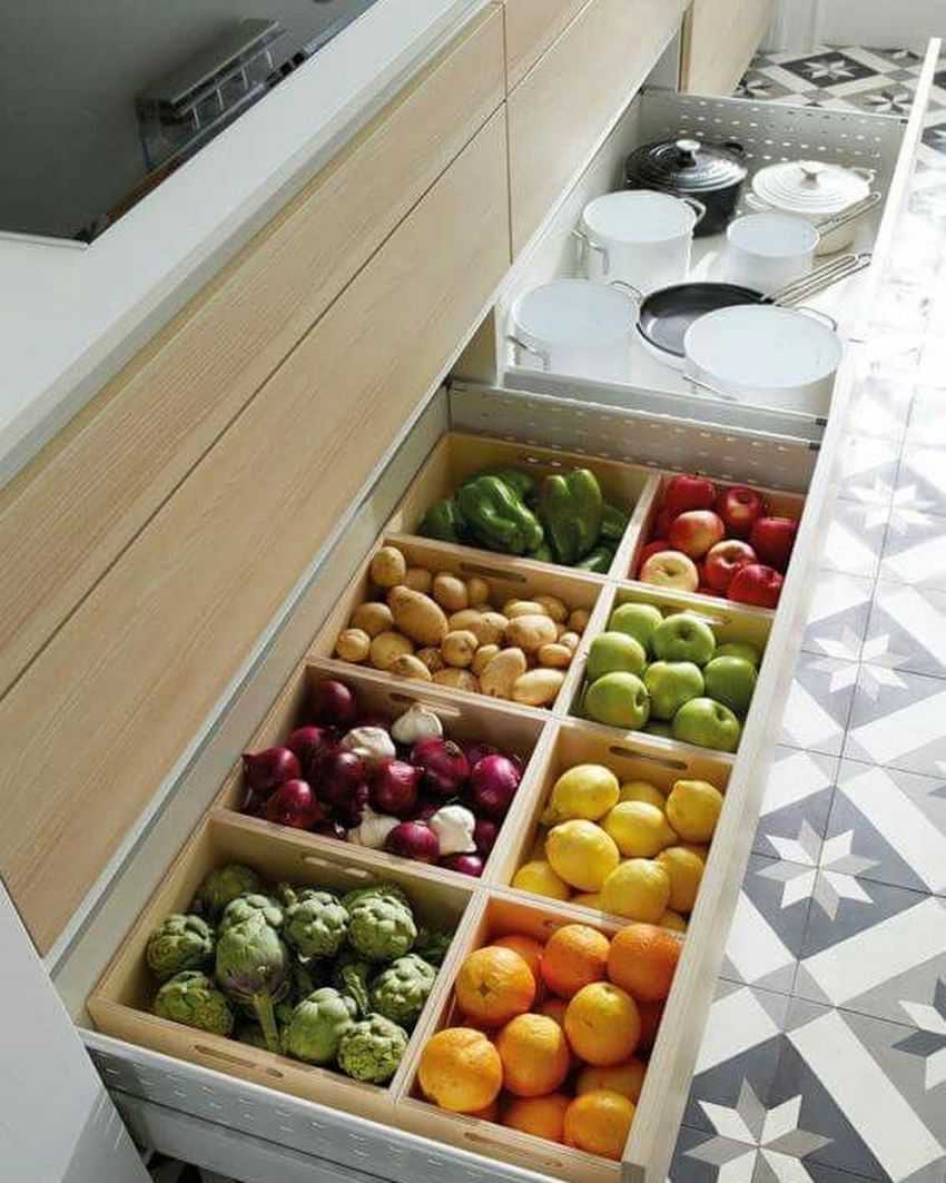 Верхнюю часть мебели стоит отвести под часто используемые вещи, а нижнюю лучше оборудовать выдвижными ящиками. Здесь могут храниться редко используемые предметы. Обязательно выделите место для хранения овощных запасов. Для этой цели можно использовать специальные лотки или плетеные корзины. Чтобы мгновенно находить нужное, украсьте контейнеры и ящички надписями.