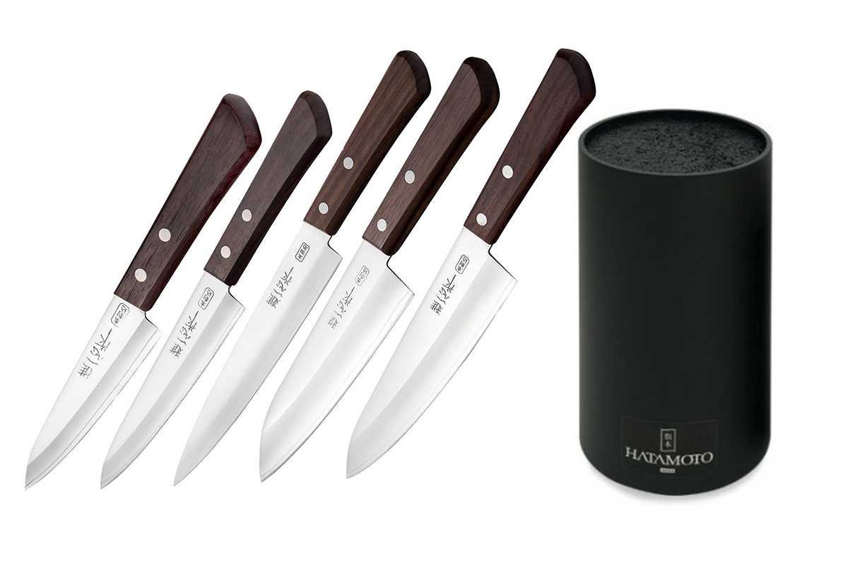 В набор входят наиболее востребованные у потребителей виды ножей (шеф-нож, универсальный нож, нож для овощей, нож для нарезки хлеба, разделочный нож) и подставка.