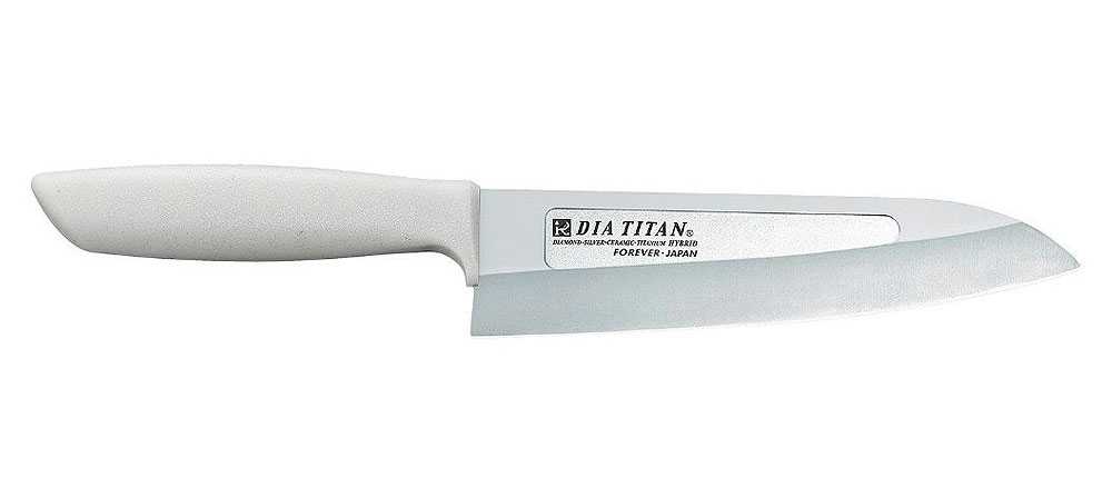 - Титановые модели. Конечно, ни один производитель не станет выпускать изделие, которое изготовлено из чистого титана. Чаще всего подобные модели выполнены из углеродистой стали, а сверху наносится напыление из титана. Но даже оно помогает превратить обычный поварской нож в надежный и прочный инструмент, которые хорошо режет любое мясо.