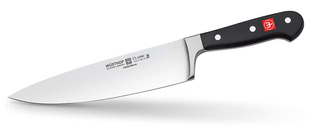 Универсальный инструмент, который может заменить большинство других ножей — кроме, пожалуй, хлебного ножа. Впрочем, многие повара обходятся только им — дело техники. Достаточно большой тяжелый нож, несмотря на свои габариты, удобен в работе. Шинковка овощей, нарезка мяса, чистка фруктов… Все это легко выполнить поварским шеф-ножом.
