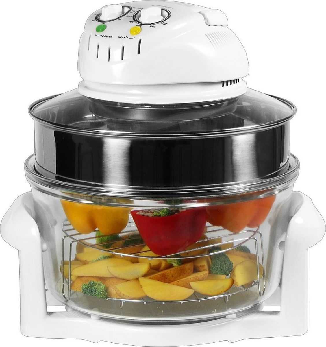 Внешне аэрогриль представляет собой стеклянную чашу на подставке с закрываемой крышкой. Внутри располагаются вентилятор и тэн.