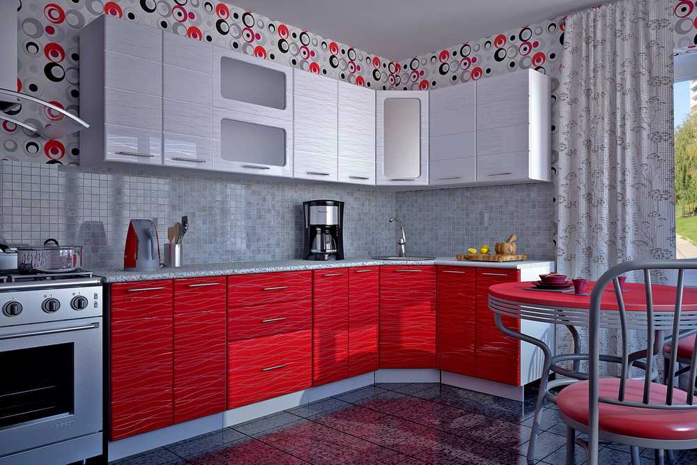 Основа всего здесь – простая геометрия, никаких замысловатых округлостей, завитушек, вензелей. Подходящие материалы – МДФ, матовое стекло, плиточные материалы. Гарнитур обычно делают красным, пол черным, стены – серыми, бежевыми. Рулонные шторы на окнах сделают оформление завершенным.