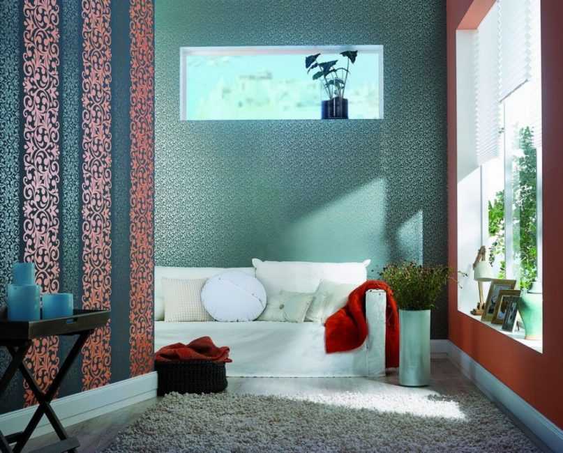 Еще один способ замаскировать ниши и различные выступы — использовать обои темных оттенков и с пестрым рисунком. Можно наоборот, выделить нестандартные конструктивные элементы с помощью ярких полотен.