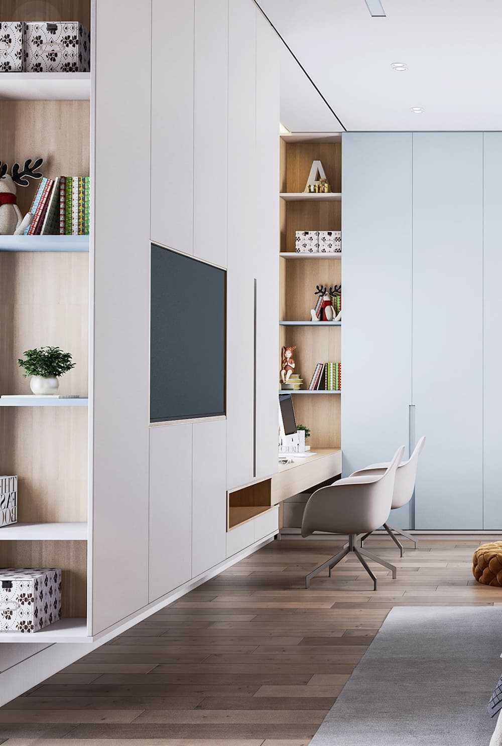 Малышам в возрасте от 2 до 5 лет требуется большая игровая зона. Маленький ребенок познает мир через игру, это его главный вид деятельности. Начиная с подготовительной группы детского садика, ребенок начинает регулярно заниматься учебной деятельностью. В комнате должны появиться: письменный стол, стул, компьютерная стойка и книжный шкаф.