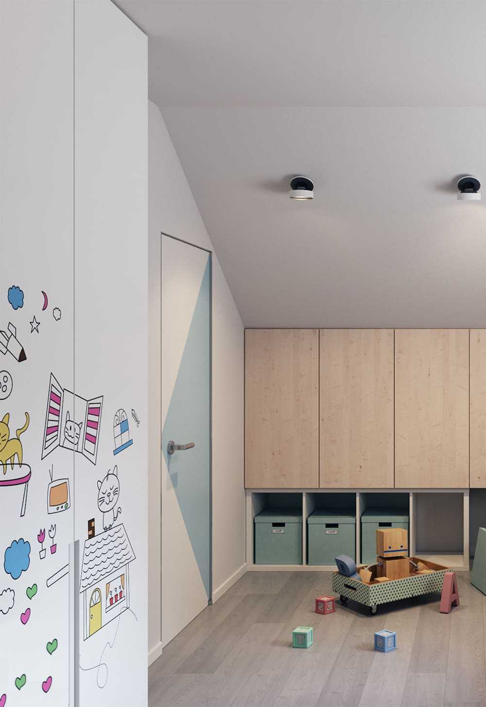 В качестве ярких пятен могут выступать игрушки. Шкаф с ними можно выделить и сделать акцентом, а можно занавесить шторой того же нежного цвета, который выбран в дополнение к белому.