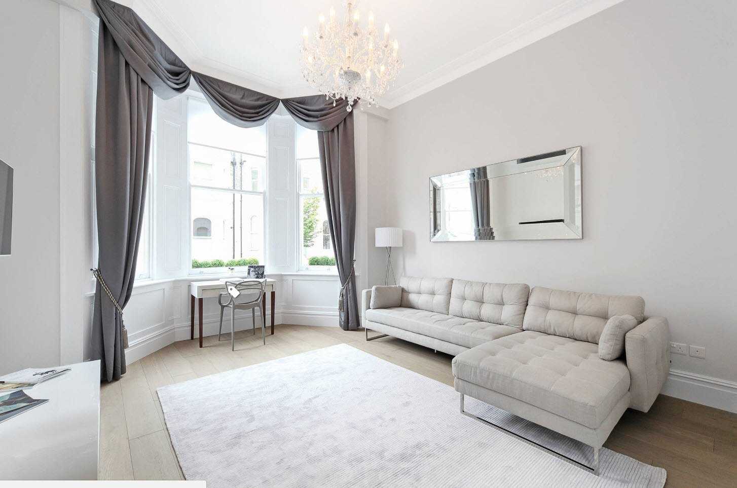 Светлые диваны хорошо смотрятся в помещении с темным полом и стенами. Они создадут необходимый цветовой акцент и придадут легкости интерьеру. Интересным может быть приобретение дивана и шторы одного неординарного цвета, к примеру, мятного, бирюзового, лимонного или фисташкового. Тогда может получиться современный интерьер в средиземноморском стиле.