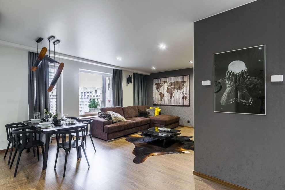 На фото интерьер гостиной-столовой в современном стиле, оформленный диваном с тканевой обивкой коричневого цвета.