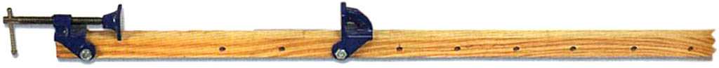 Последний момент – сборка (сплачивание) из досок мебельных щитов, они же мебельный массив. По идее, для этого нужны специальные приспособления – ваймы – по 3 на столешницу, по 4 на боковины шкафа и по 2 на меньшие щиты. Тут, во-первых, одну вайму можно заменить парой губок с обоймами для крепления на штанге, а на штангу пойдет отрезок бруса подходящей под обоймы толщины, см. рис; обычно 60 мм. Комплекты губок для вайм и длинных струбцин-стяжек продаются отдельно.