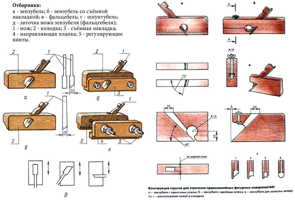 Также нужны будут отборные (ударение на «ы») рубанки-зензубели прямой и скошенный (слева на рис.) Прямым зензубелем снимают фальцы и выбирают пазы вдоль волокон, а косым поперек и застругивают торцы.