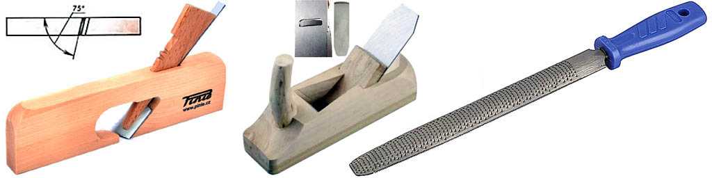 Для начала кроме электролобзика (мы не педанты, этот инструмент не очень дорог, часто нужен и лучше лучковой пилы во всех отношениях) понадобится обычный столярный рубанок, ручной фуганок и набор рашпилей по дереву. На первых порах хватит одного т. наз. кабинетного рашпиля, плоско-выпуклого с зауженным концом, справа на рис.: