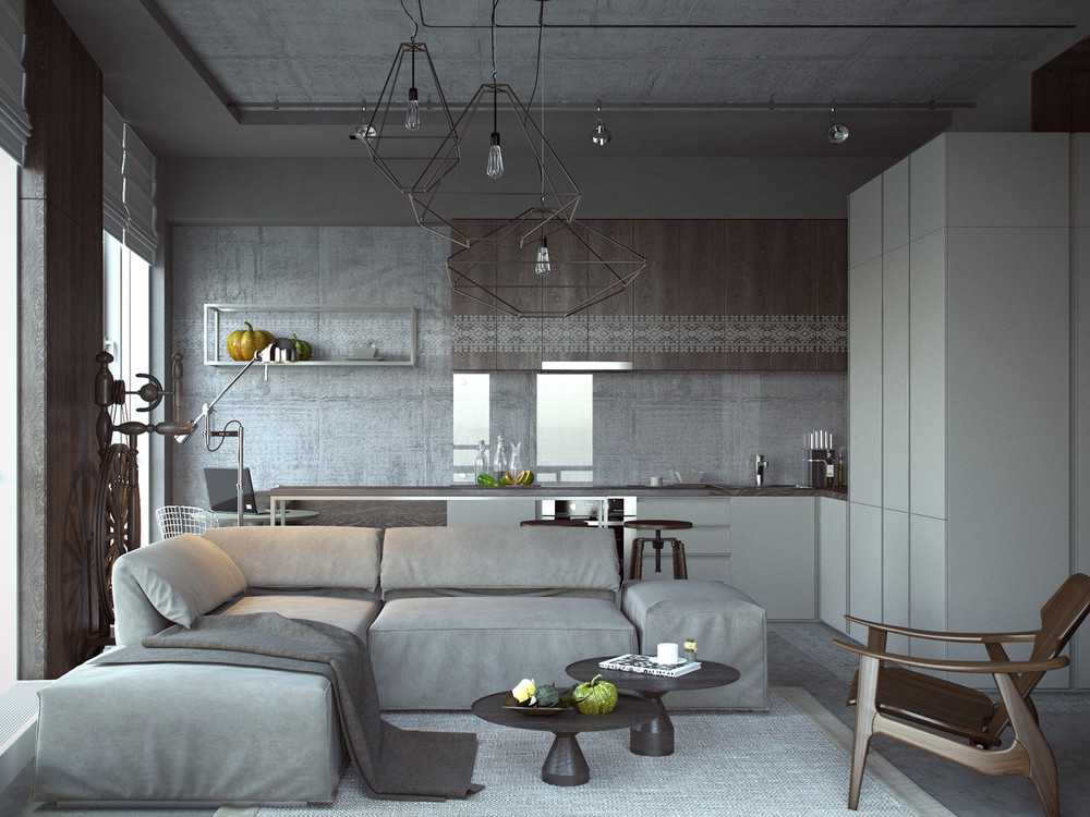 Гocтинaя в cтилe лoфт c пpeoблaдaниeм cвeтлыx oттeнкoв