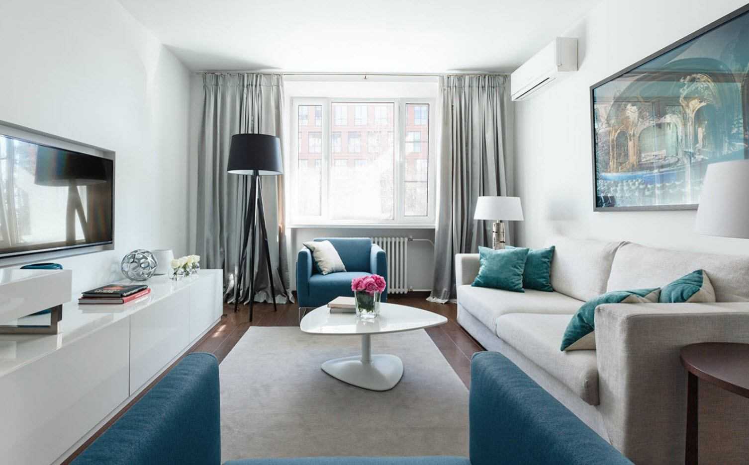 Чтобы зал выглядел гармонично, нужно подобрать правильную композицию. В дизайне активно используют цвета из разных палитр, расставляя акценты или играя на холодном или теплом звучании. Для интерьера в светлых тонах существует несколько актуальных стилей.