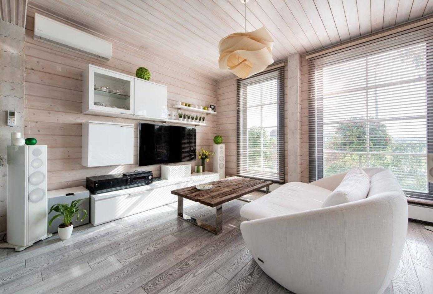 Гостиную в белом цвете легко представить в этом прохладном стиле. Такой интерьер предполагает экологичность и естественность. Природные материалы и грубые фактуры деталей делают стиль сдержанным и спокойным. Массивной мебели здесь не место, вместо нее используются сборные секции и легкие полки из березы или сосны. Организовать уютную обстановку можно с помощью шерстяных пледов и декоративных подушек, а свечи и лампы с ароматом дополнят комфортную атмосферу. Подходящие для направления оттенки – кирпичный, горчичный и шоколадный. Это должны быть теплые и насыщенные цвета, но яркость здесь неуместна.