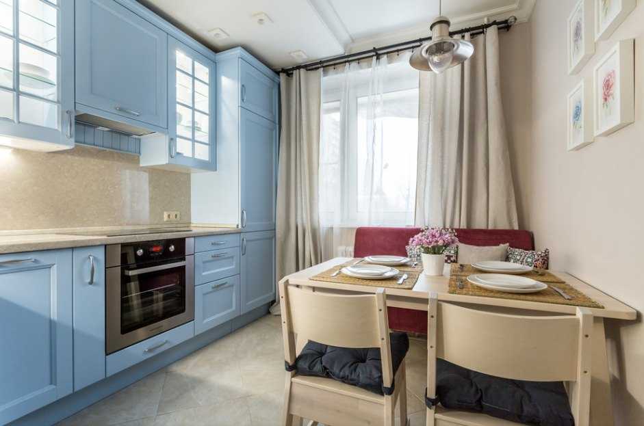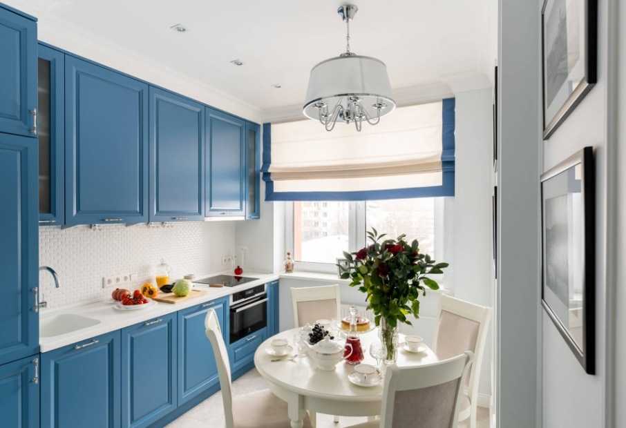 Фасады кухонного гарнитура в стиле неоклассика могут быть светло-синего цвета или глубокого, темного, с прямой фрезеровкой, стеклянными вставками, хромированные или золотистые ручки для дверей. В неоклассике можно оформить холодный интерьер кухни, использовать хрустальную посуду и люстру, белые стены и потолок, серый пол и мебель в темных тонах. Дополнить интерьер высокими стульями с мягкой синей обивкой, обоями с классическими принтами и перламутровым эффектом. Шторы в тон кухонному гарнитуру или теплого бежевого цвета для визуального баланса.
