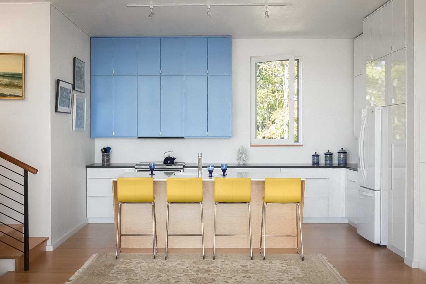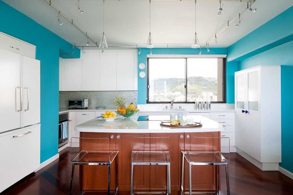 Одной из самых сильных тенденций стиля в современном дизайне кухни является голубой цвет, который можно выбрать от классических шикарных кухонь до минималистичных современных пространств. Будь то стены, полы, шкафчики или кафель, голубой главенствует в нынешних интерьерах. Для создания мягкой вдохновленной побережьем кухни, рассмотрите мягкие небесно-голубые оттенки. Будьте ближе к природе, создайте в комнате огромное голубое небо, наполненное белыми облаками и прекрасными танцующими волнами, встречающими с песчаным пляжем.