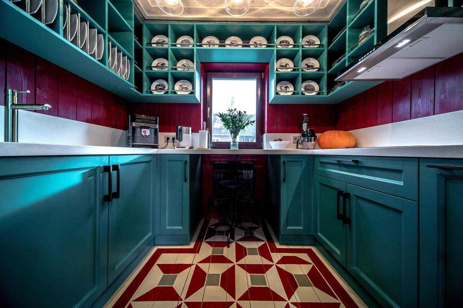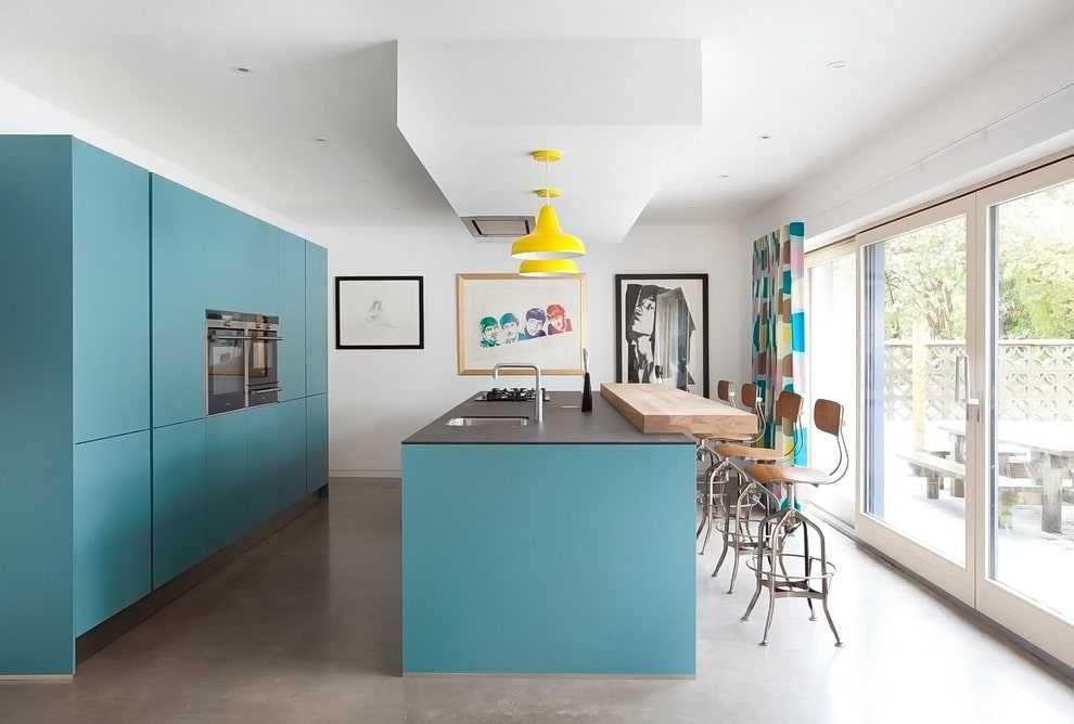 Голубая кухня с массивной люстрой станет главной «фишкой» дома