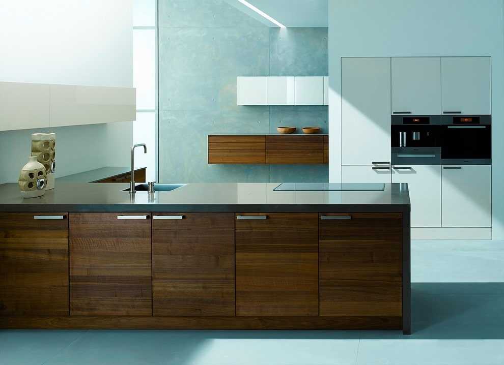 Коричневый цвет все чаще используют для кухонного гарнитура. При этом остальная часть помещения может быть выполнена в голубом цвете. Такое сочетание позволяет сделать кухню визуально очень красивой, но при этом необычной.