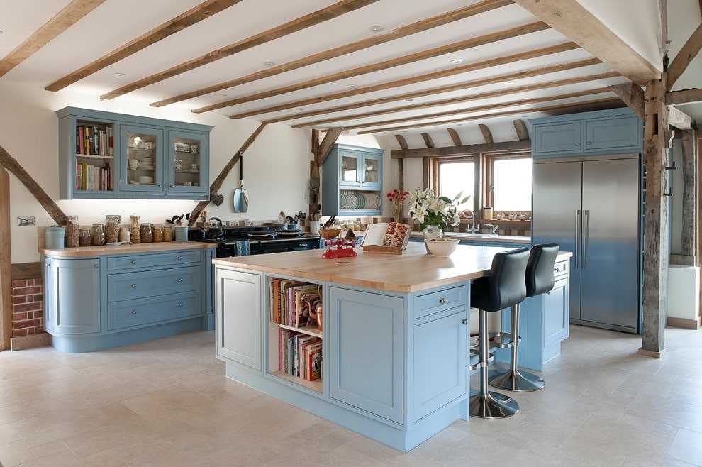 Сочетание различных оттенков синего также уместно в оформлении кантри кухни. Оттенки могут отличаться друг от друга на 1-2 тона. К данному интерьеру подойдут бежевые стены и деревянная отделка потолка.