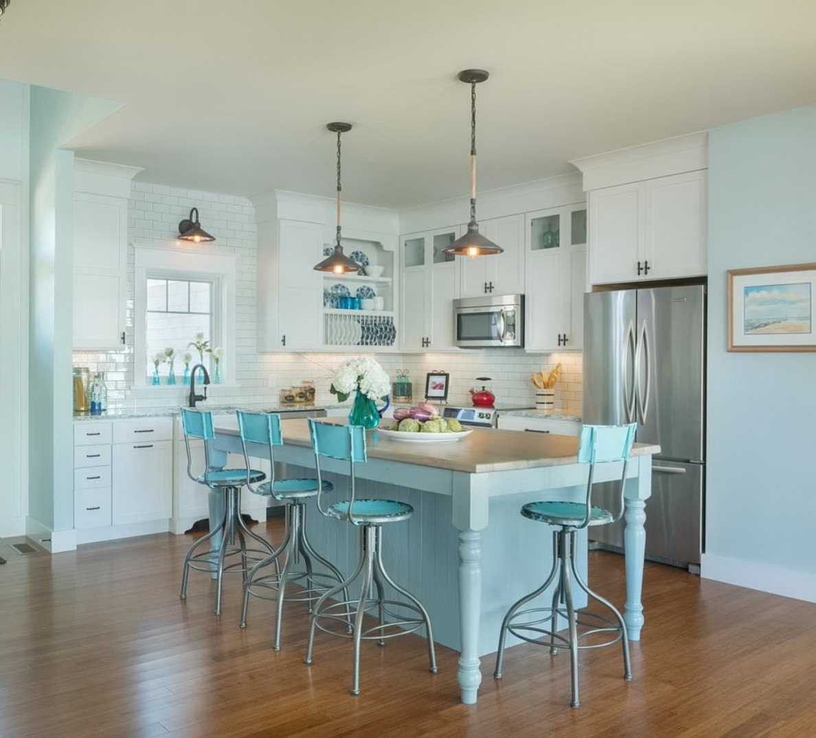 Голубой — это цвет неба и океана, поэтому он успокаивает и создает отличные условия для домашнего очага. Голубые шкафы сочетаются с мраморными столешницами, а кухонная утварь в таком цвете наделяет интерьер игривостью.