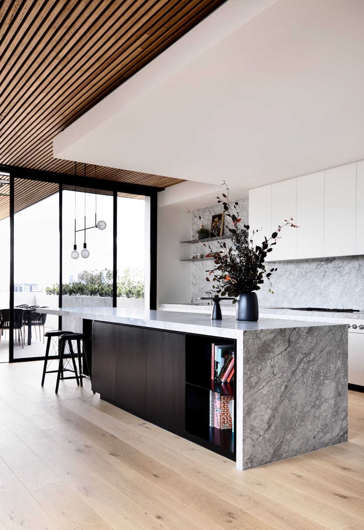 Кухня, объединенная с гостиной, стала одним из популярных решений для студии. Двухуровневый потолок позволяет гармонично оформить перекрытия и одновременно разделить две функциональные зоны.