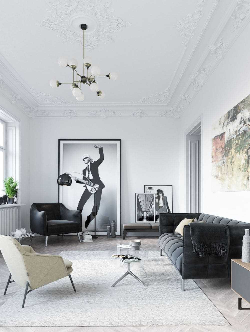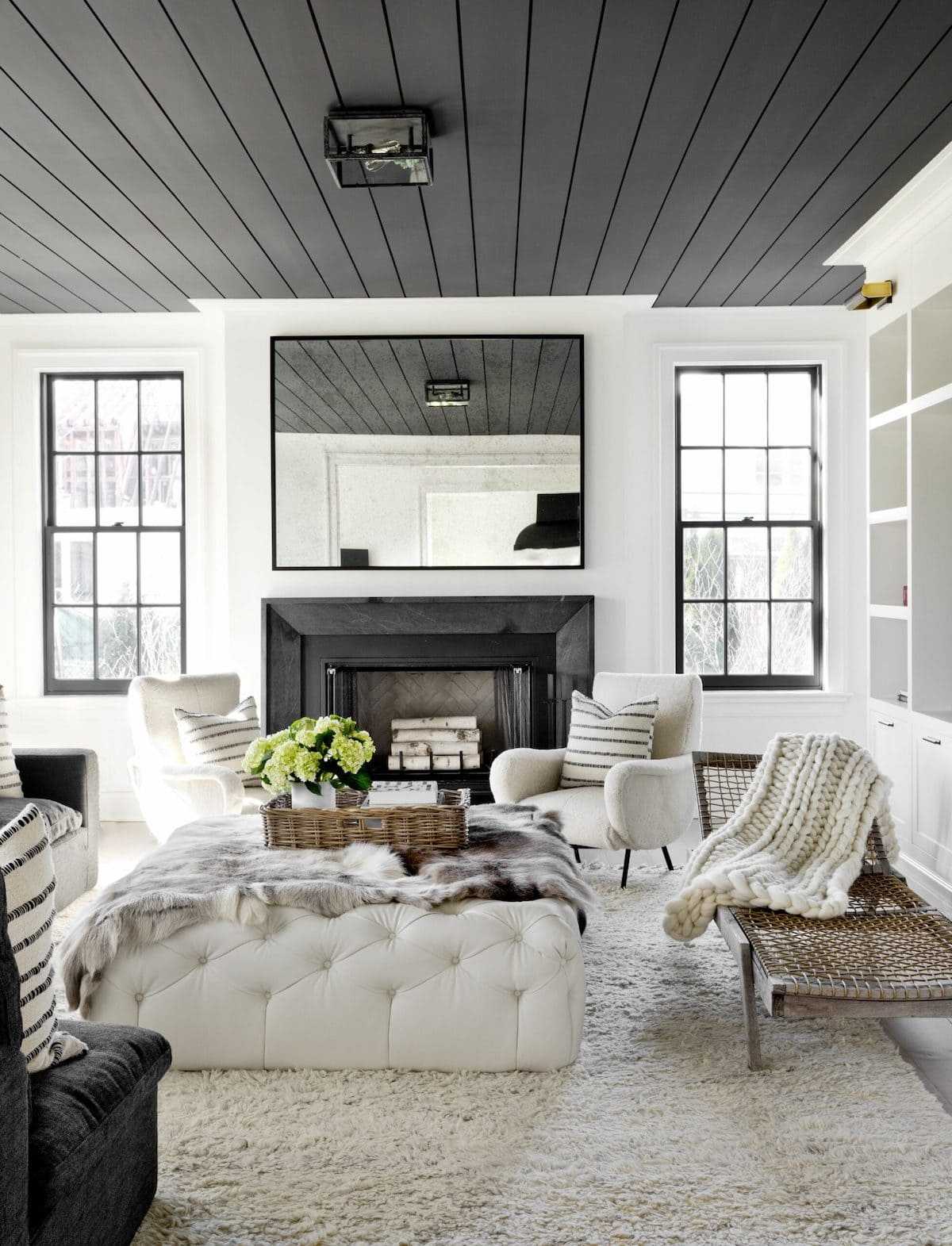 Традиционный белый потолок не утрачивает актуальности и в 2022 году. Для освежения поверхности используют меловый, известковый раствор или краску — водоэмульсионную. При желании можно добавлять колер.