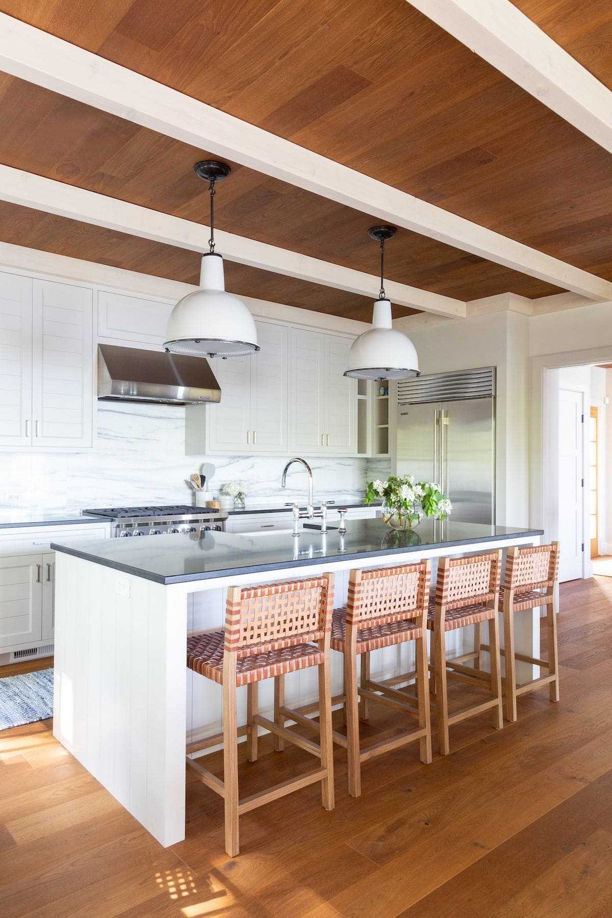- Деревянные варианты отделки обычно используют в виде балок, но это может быть и разновидность реечного потолка на кухне, который мыть можно, но изредка. Кроме того, такой материал способен впитывать влагу, ароматы, разрушаться под воздействием перепадов температуры. Поэтому древесину выбирают только для помещений с хорошей вентиляцией и с высоким потолком.