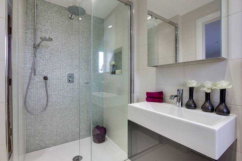 Просторная душевая кабина подойдет для семейной пары, которая предпочитает принимать водные процедуры вдвоем. Также это хороший вариант для пожилого человека, которому тяжело самому выбираться из ванны. Здесь также будет уместна прозрачная перегородка, позволяющая зрительно увеличить комнату. Для усиления эффекта ванную можно украсить большим зеркалом.