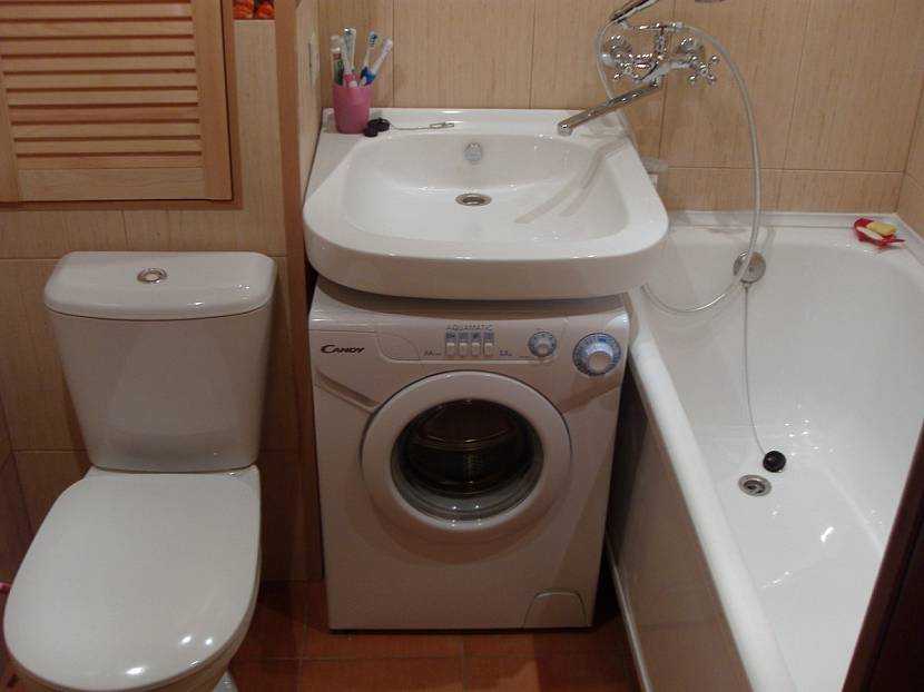 - Размещение стиральной машинки под раковиной, которая крепится к стене