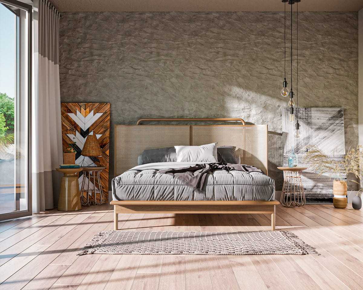 Наиболее важными являются мебель и деревянные аксессуары. Составленный таким образом декор будет модным и долговечным, так как древесина приобретает красоту с годами. Композиция может быть дополнена натуральными тканями, например, из хлопка, шерсти, шелка или льна. Постельные принадлежности, занавески, наволочки, покрывала или плетеные из них изделия будут идеально соответствовать дизайну и выполнять функцию практичных и красивых украшений. Экологические добавки, украшения и безделушки создадут уютную атмосферу, которая ожидается в спальне.